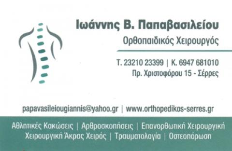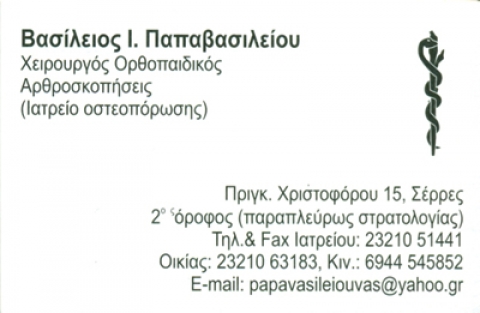 Ωράριο Παπαβασιλείου Βασίλειου:Δευτέρα - Παρασκευή 11:00 - 14:30 & 18:00 - 21:00εκτός Τετάρτης απογεύματος